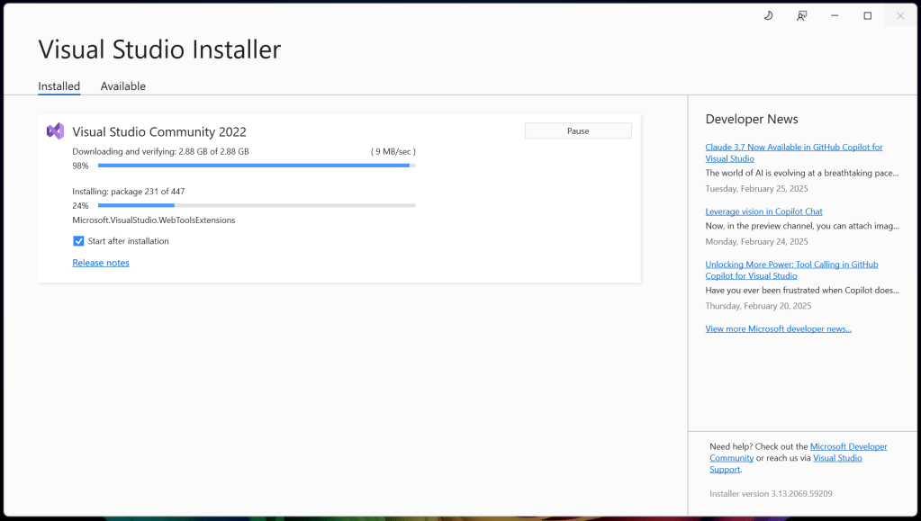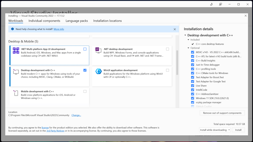 Following the instructions, here, I first installed the Visual Studio Community Edition with “Desktop Development with C++”