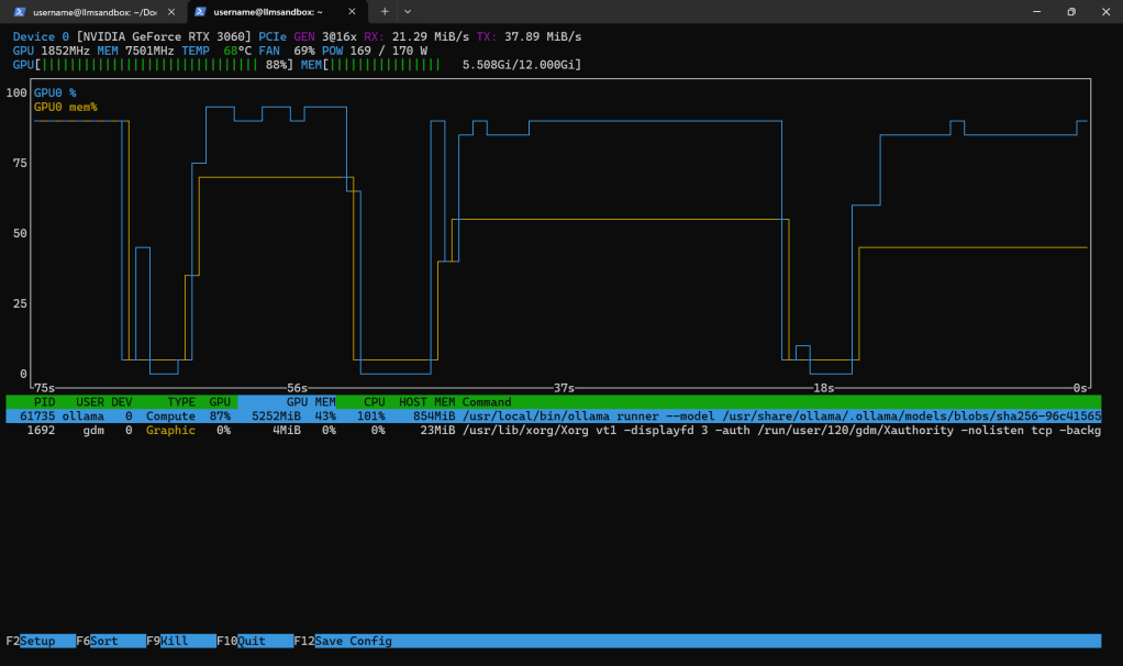 We can see, by running nvtop, the activity on the GPU – note the different GPU MEM consumption based on the size of the model: